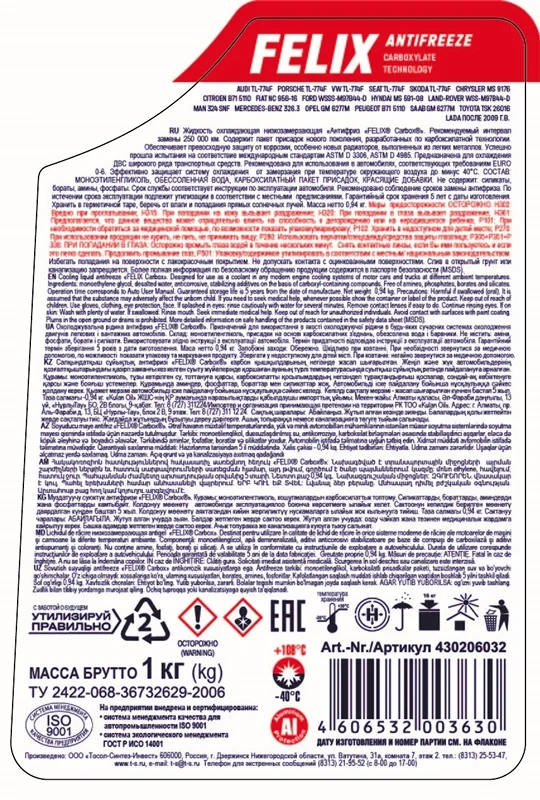 Профессиональный антифриз с увеличенным ресурсом эксплуатации (тип OAT). Соответствует требованиям стандарта G12+ по классификации Volkswagen. Отвечает требованиям спецификаций импортных автопроизводителей и международным стандартам SAE J 1034, O-Norm V 5123, BS6580:2010, KSM2142, JIS K 2234. Единственный российский антифриз, успешно прошедший полный цикл испытаний в международной лаборатории ABIC TESTING LABORATORIES, INC по стандартам: ASTM D 3306, ASTM D 4985. Полностью совместим с оригинальными (OEM) антифризами, разработанными по передовой карбоксилатной технологии. Обладает увеличенным сроком эксплуатации – 250 000 км пробега или 5 лет использования (без смешивания с другими типами охлаждающих жидкостей). Цвет: красный. Готовый к применению. Обладает рядом официальных допусков и одобрений для отечественных автомобилей. Используется для первой конвейерной заливки на многих отечественных и зарубежных сборочных предприятий.