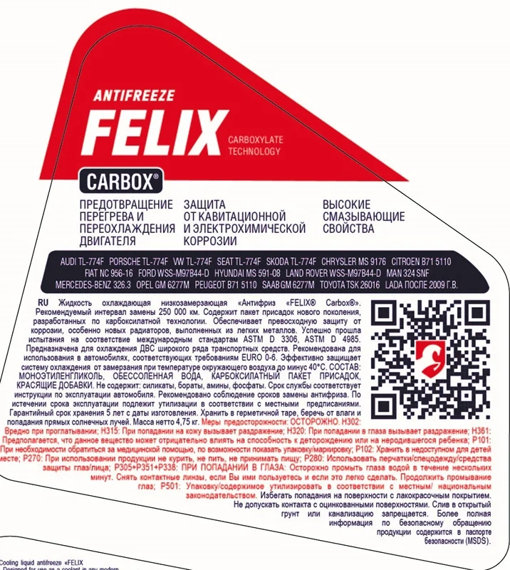 Профессиональный ант??фриз с увеличенным ресурсом эксплуатации (тип OAT). Соответствует требованиям стандарта G12+ по классификации Volkswagen. Отвечает требованиям спецификаций импортных автопроизводителей и международным стандартам SAE J 1034, O-Norm V 5123, BS6580:2010, KSM2142, JIS K 2234. Единственный российский антифриз, успешно прошедший полный цикл испытаний в международной лаборатории ABIC TESTING LABORATORIES, INC по стандартам: ASTM D 3306, ASTM D 4985. Полностью совместим с оригинальными (OEM) антифризами, разработанными по передовой карбоксилатной технологии. Обладает увеличенным сроком эксплуатации – 250 000 км пробега или 5 лет использования (без смешивания с другими типами охлаждающих жидкостей). Цвет: красный. Готов к применению. Обладает рядом официальных допусков и одобрений для отечественных автомобилей. Используется для первой конвейерной заливки на многих отечественных и зарубежных сборочных предприятий.