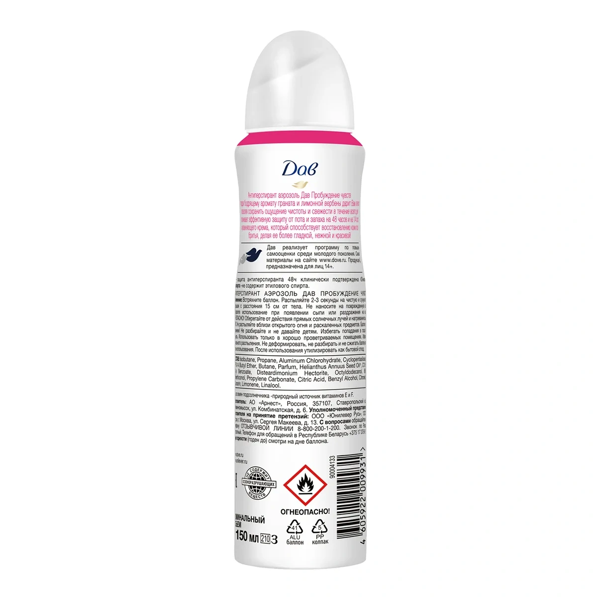 Бренд Dove создает косметику с заботой о коже и природе. Продукция на четверть состоит из увлажняющего крема и не тестируется на животных. Рекламные кампании проводятся без участия актрис и профессиональных моделей. На фотографиях и в видеороликах вы увидите самых обычных женщин без ретуши и цифровой обработки. Антиперспирант и вся линейка средств Dove помогают осознать, что естественная красота – это источник уверенности в себе, а не беспокойства. Спрей для женщин и девушек от 14 лет способствует повышению самооценки, формированию положительного отношения к своей внешности. Dove антиперспирант Пробуждение чувств, 150 мл эффективно защищает от пота и его последствий на 48 ч. Аэрозоль можно использовать после бритья и депиляции: антиперспирант успокаивает раздраженную кожу, помогает восстановить ее за три дня. Helianthus Annuus Seed Oil (масло семян подсолнечника), уникальный природный источник витамина E и F, препятствует негативному воздействию свободных радикалов и помогает коже быстрее справиться с повреждениями. Антиперспирант обладает бодрящим ароматом граната и лимонной вербены. Средство эффективно нейтрализует запах пота и придает ощущение свежести после физической активности и занятий спортом. Спрей выпускается в удобном баллоне, который перед использованием рекомендуется встряхнуть. Средство наносится на чистую и сухую поверхность подмышек на расстоянии 15 см от тела. Антиперспирант женский не содержит этиловый спирт, потому не сушит кожу любого типа. Он заботится о вашем теле при каждом применении.