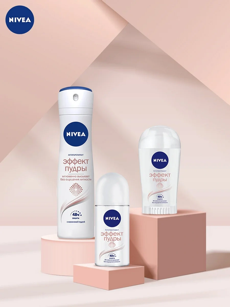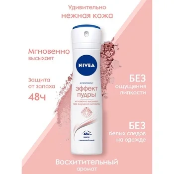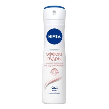 Дезодорант-антиперспирант спрей Nivea Эффект Пудры сочетает в себе надежную защиту антиперспирирующей формулы и невероятную мягкость уникального природного компонента - каолиновой пудры. Каолин, также известный как Белая глина, обладает отличными абсорбирующими и обволакивающими свойствами, поэтому сразу после нанесения дезодорант мгновенно высыхает, не оставляя липких ощущений на коже, и придает ей невероятную мягкость. Антиперспирант защищает от неприятного запаха на 48 часов. Без ощущения липкости на коже и без белых следов на одежде. Уже более 100 лет Nivea создает особенно бережные для кожи формулы. Испытай невероятную мягкость и эффективную защиту от пота и неприятного запаха! Обладает нежным ароматом сливочных и ярких пудровых ноток.