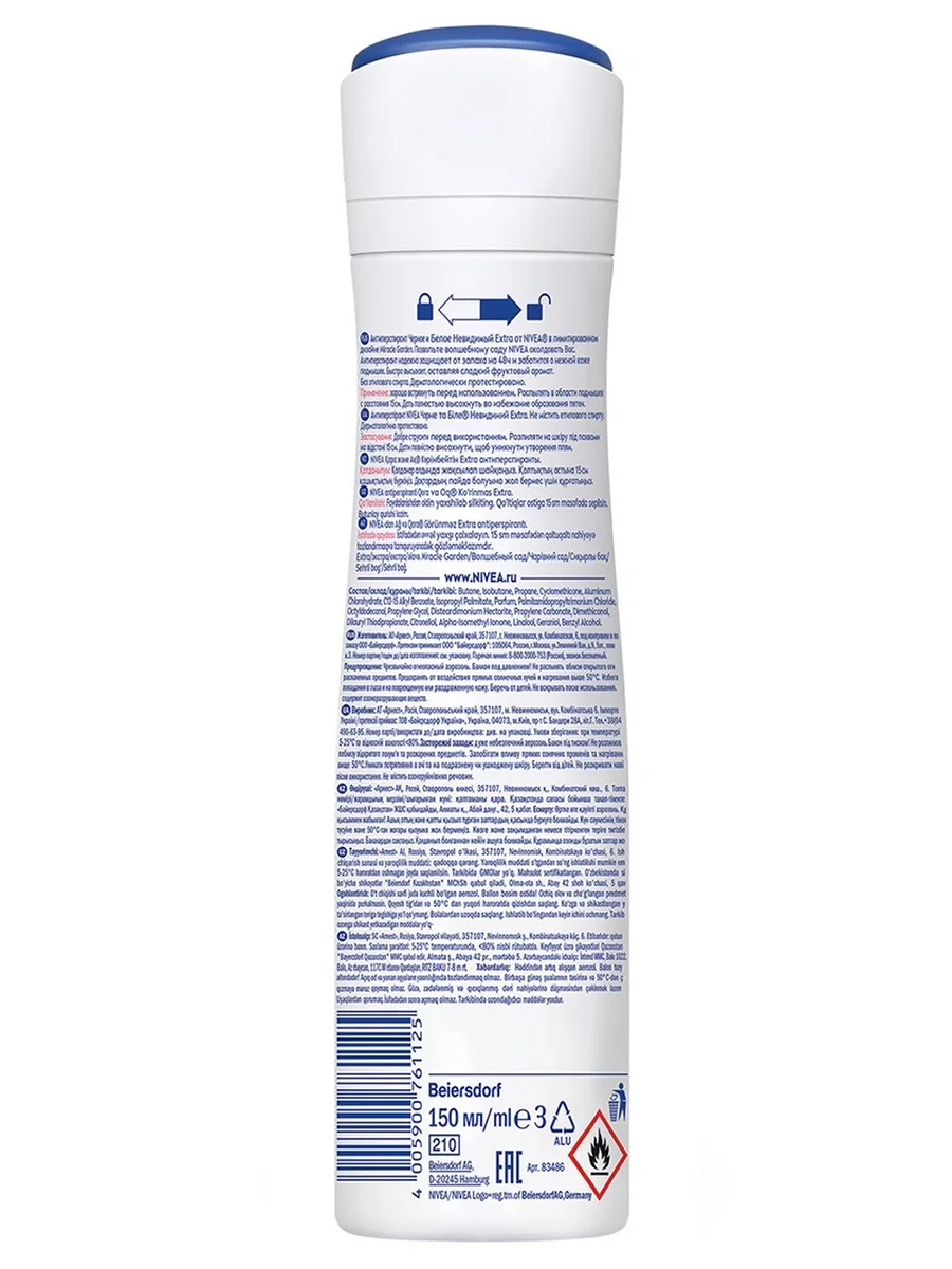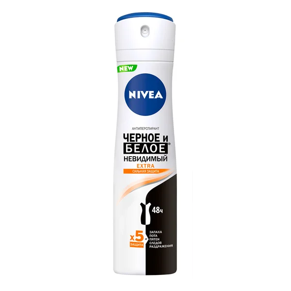 Дезодорант-антиперспирант спрей Nivea Черное и Белое Невидимый Extra предотвращает появление белых пятен на темной одежде и желтых пятен на светлой одежде. Черная одежда остается черной, а белая одежда дольше остается белой. Уникальная формула имеет 5 факторов защиты: от запаха, пота, пятен, следов и раздражения. Защищает кожу подмышек в течение 48 часов от пота и неприятного запаха. Этот чистый, кристальный и яркий сладковатый аромат - выражение естественной женственности. Не содержит этилового спирта. Сильная защита и забота о коже от Nivea на каждый день!