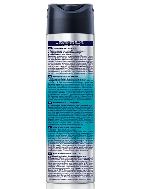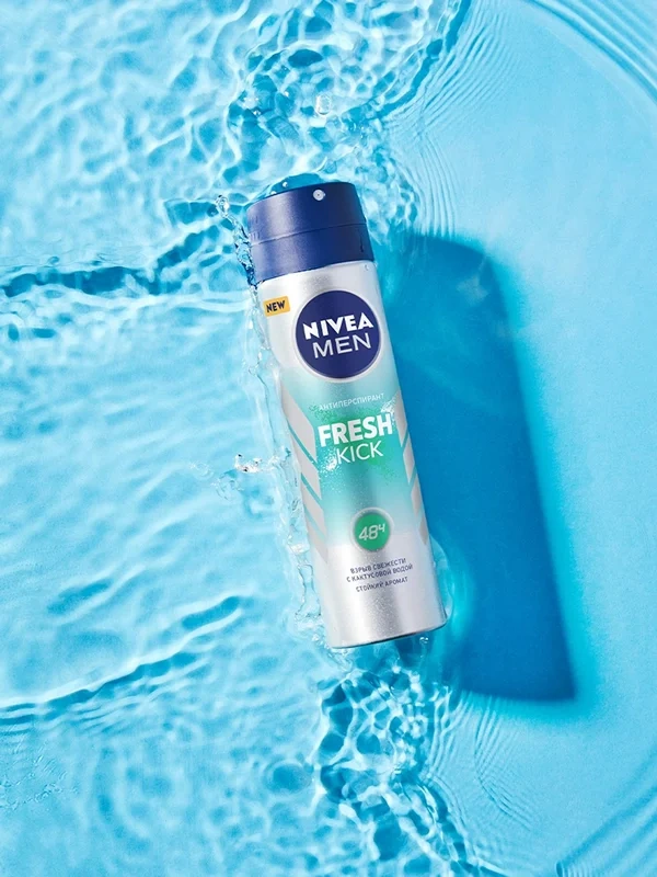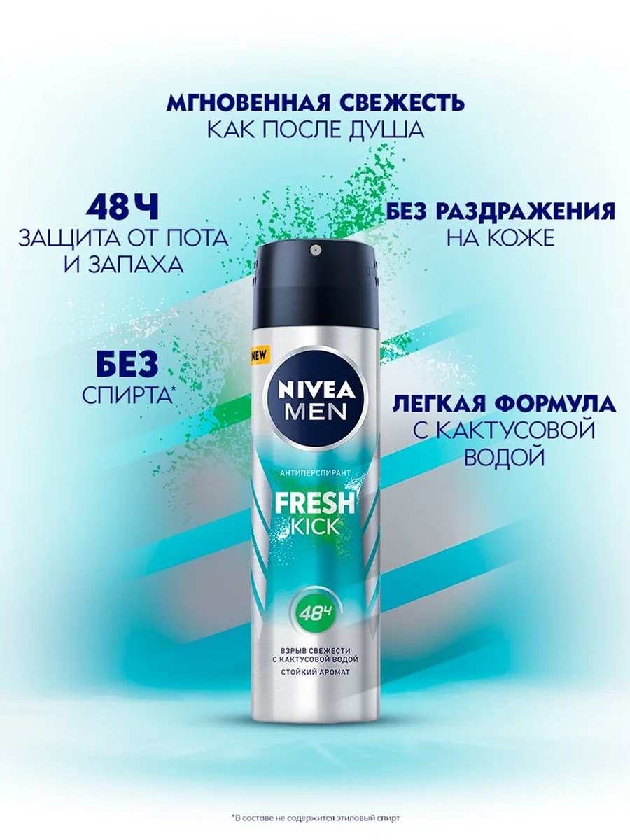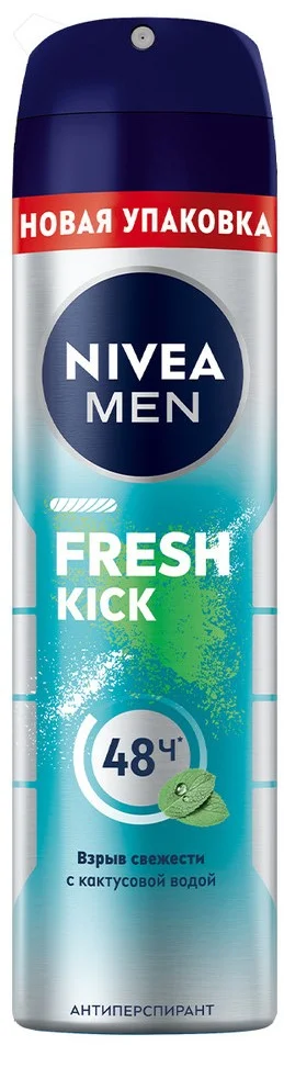 Ощутите взрыв свежести вместе с новым антиперспирантом Nivea Fresh Kick с кактусовой водой в стильном дизайне в формате спрея. Антиперспирант подарит вам чувство бодрящей свежести, стойкий аромат и надежную защиту от пота и запаха на протяжении 48 часов. Новый Nivea Fresh Kick обеспечивает не только свежесть, а также уверенность и комфорт на весь день.Необычным компонентом нового антиперспиранта является кактусовая вода, которая вместе с другими ингредиентами дает ощущение свежести от Nivea Fresh Kick как после душа в жаркий день! Защитите себя от пота, забудьте о неприятном запахе и раздражении, вместо этого почувствуйте чистоту после каждого применения. Будь естественно свеж вместе с Nivea Fresh Kick!