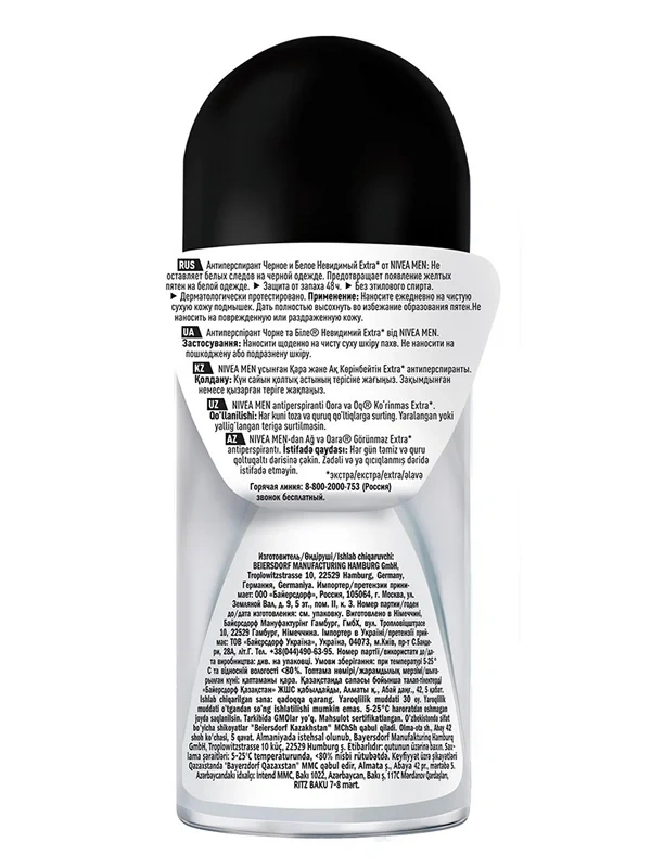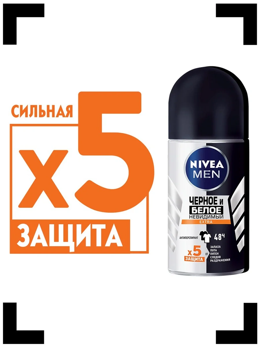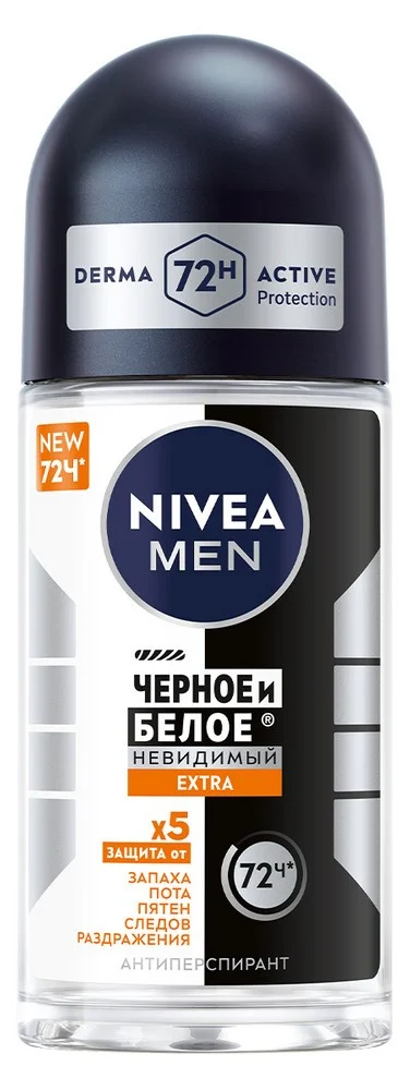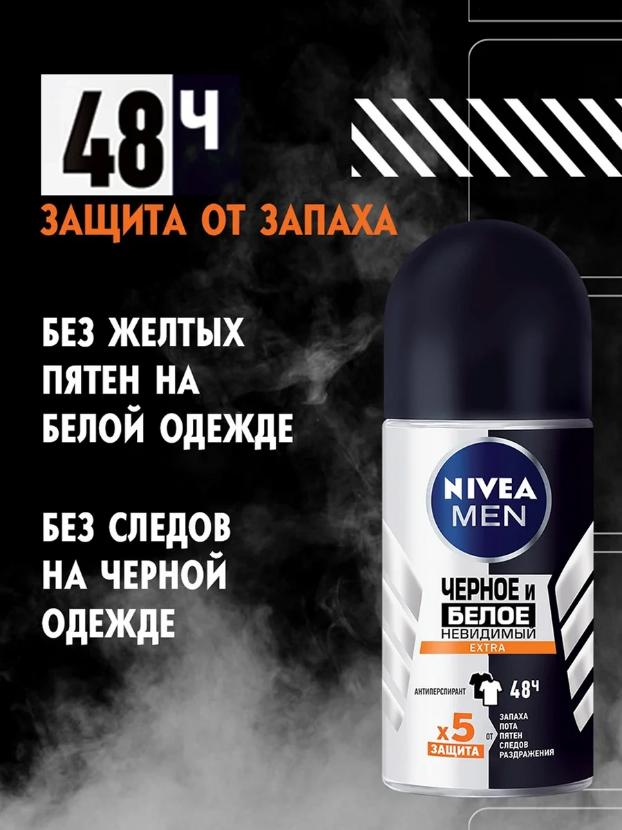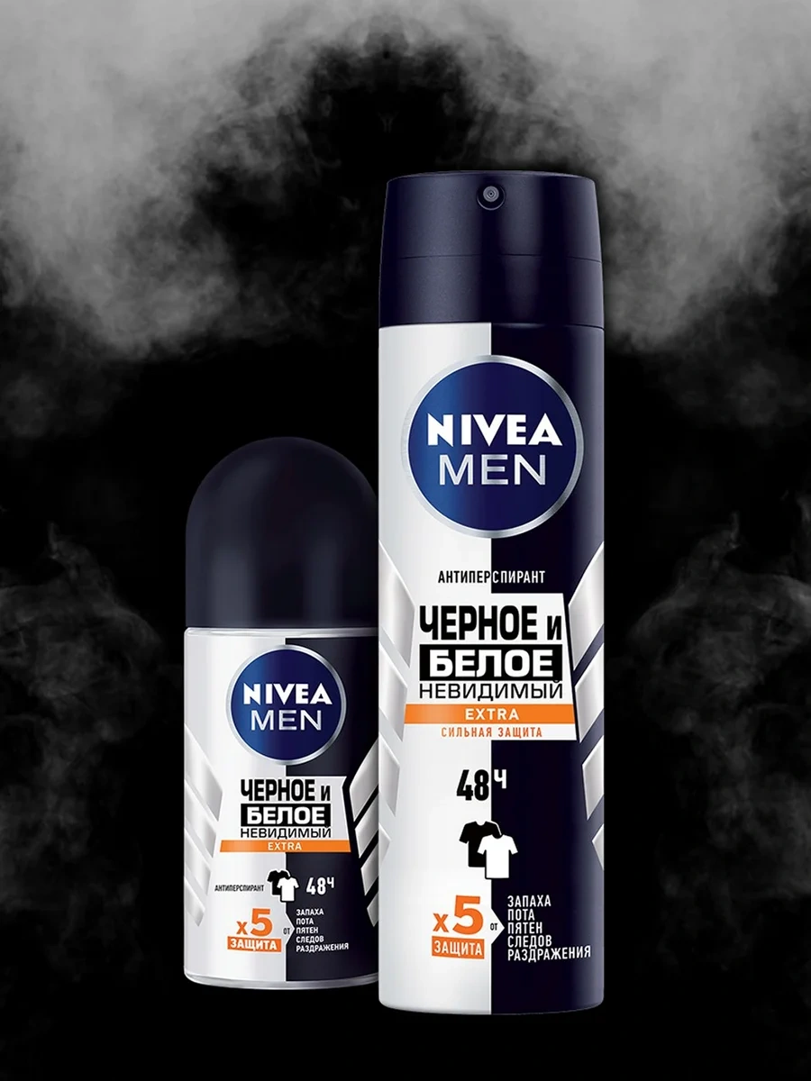 Роликовый дезодорант-антиперспирант Nivea Черное и Белое Невидимый Extra предотвращает появление белых пятен на темной одежде и желтых пятен на светлой. Черная одежда остается черной, а белая одежда дольше остается белой. Уникальная формула имеет 5 факторов защиты от: запаха, пота, пятен, следов и раздражения. Защищает кожу подмышек от неприятного запаха в течение 48 часов и обладает сверхсильной формулой защиты, которая действует даже в стрессовых ситуациях или при интенсивных занятиях спортом. Не содержит этилового спирта. Настоящий мужской аромат для ощущения чистоты и свежести на весь день. Сильная защита и забота о коже от Nivea на каждый день! Шариковый антиперспирант даёт в 2 раза больше применений, чем спрей!
