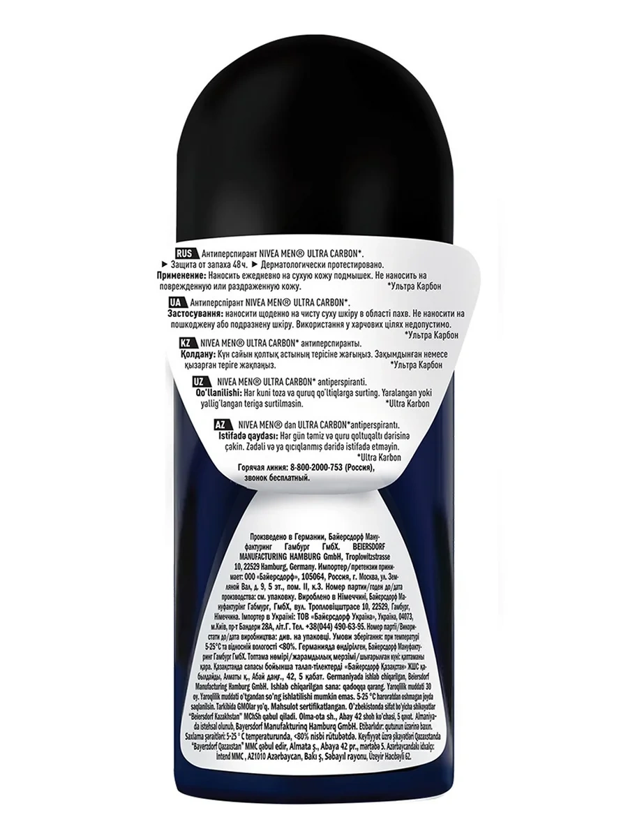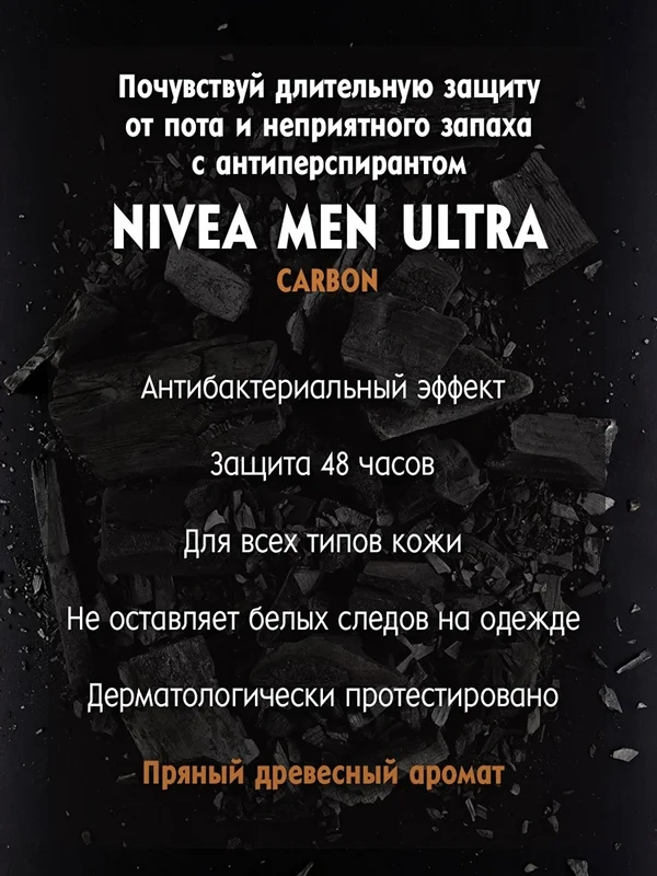 Дезодорант-антиперспирант ролик Nivea Men Ultra Carbon с антибактериальным эффектом препятствует размножению бактерий, вызывающих неприятный запах. Уникальная формула с черным углеродом эффективно действует против пота, сохраняет подмышки сухими и, таким образом, предотвращает неприятный запах тела. Антиперспирант обеспечивает надежную 48-часовую защиту от пота и запаха, заботясь о вашей коже. Стойкий пряный древесный аромат создан специально для мужчин. Антиперспирант не оставляет видимых следов на коже или одежде. Только ощущение сухой и чистой кожи в течение всего дня. Сильная защита и забота о коже от Nivea на каждый день! Шариковый антиперспирант даёт в 2 раза больше применений, чем спрей!