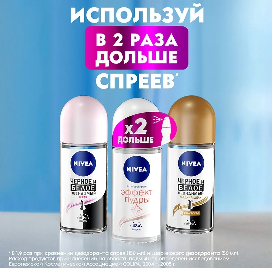Шариковый дезодорант-антиперспирант для женщин Nivea Невидимая защита благодаря инновационной формуле обеспечивает надёжную защиту от потоотделения и запаха, и подарит великолепное ощущение чистой кожи. Прозрачная формула продукта не оставляет видимых следов на коже и белых пятен на одежде. Антиперспирант защищает от неприятного запаха на 48 часов. Без ощущения липкости на коже. Уже более 100 лет Nivea создает особенно бережные для кожи формулы. Попробуй мягкий уход за кожей от антиперспиранта Nivea без спирта! Шариковый антиперспирант даёт в 2 раза больше применений, чем спрей!