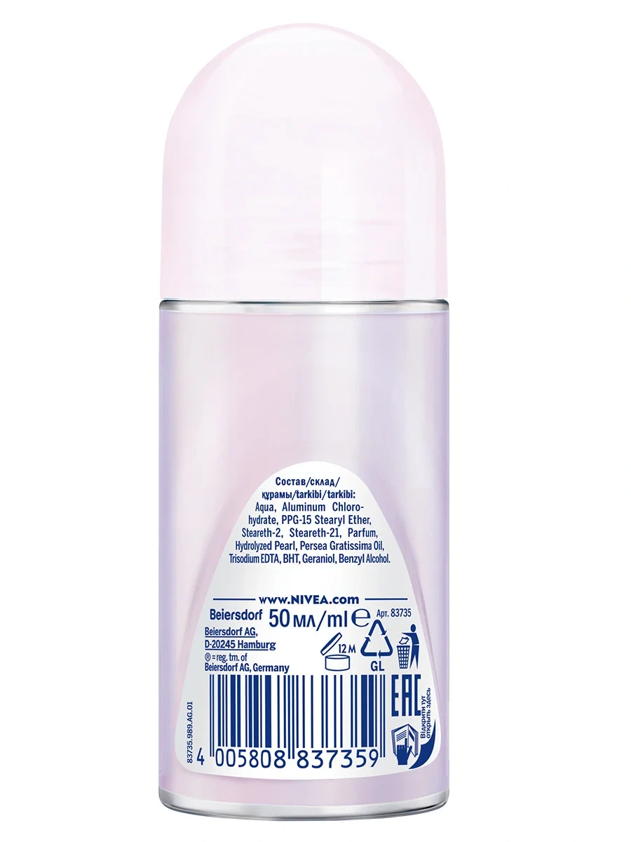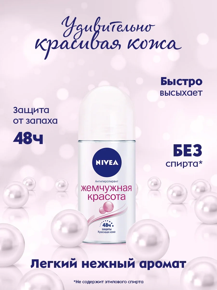 Шариковый дезодорант-антиперспирант для женщин Nivea Жемчужная красота, благодаря своей формуле с экстрактом натурального жемчуга, обеспечивает надёжную защиту от потоотделения и неприятного запаха на 48 часов, а также выравнивает тон кожи подмышек. Слишком красивых, чтобы их прятать! Дезодорант-антиперспирант не содержит этилового спирта в составе и быстро высыхает. Дерматологически протестировано. Уже более 100 лет Nivea создает особенно бережные для кожи формулы. Попробуй нежный уход за кожей от антиперспиранта Nivea без этилового спирта! Шариковый антиперспирант даёт в 2 раза больше применений, чем спрей!