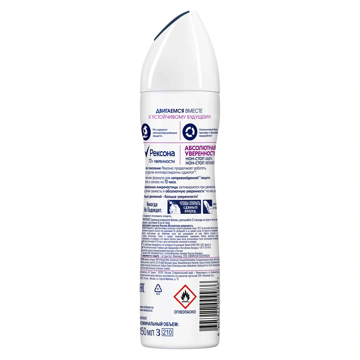 Ты хочешь чувствовать свежесть и защиту и хочешь быть уверенной в каждом своем движении? Тогда тебе нужен дезодорант - антиперспирант аэрозоль длительного действия Рексона Абсолютная уверенность с искрометными нотками грейпфрута и яблока. Вместе с защитой от пота и запаха в течение 48 часов технология Motionsense дарит тебе непревзойдённое** ощущение свежести. Микрокапсулы, нанесенные на поверхность кожи, раскрываются при каждом движении, непрерывно высвобождая дополнительный аромат. Прогулочный шаг, неспешная пробежка, спринтерский бег ? тебе все по плечу, ведь мы позаботились о твоей защите. Чем бы ты ни занималась, ты будешь чувствовать только уверенность и комфорт. Насладись захватывающим свежим цветочно-цитрусовым ароматом с ориентальными нотками пачули, ванили и сливово-персиковым акцентом. Ты создана для движения. Теперь у тебя есть антиперспирант, который сможет подстроиться под ритм твоей жизни.Покоряете ли вы новую вершину, спешите ли на автобус, выступаете ли с докладом или идете на свидание, будьте уверены, вы надежно защищены от пота и запаха - что бы вы ни запланировали, у Рексона есть решение! Наши продукты работают так же эффективно, как и вы. Мы стремимся узнать о поте как можно больше, чтобы затем использовать полученные знания для создания инновационных формул наших продуктов. Будь уверена, Рексона никогда не подведет!