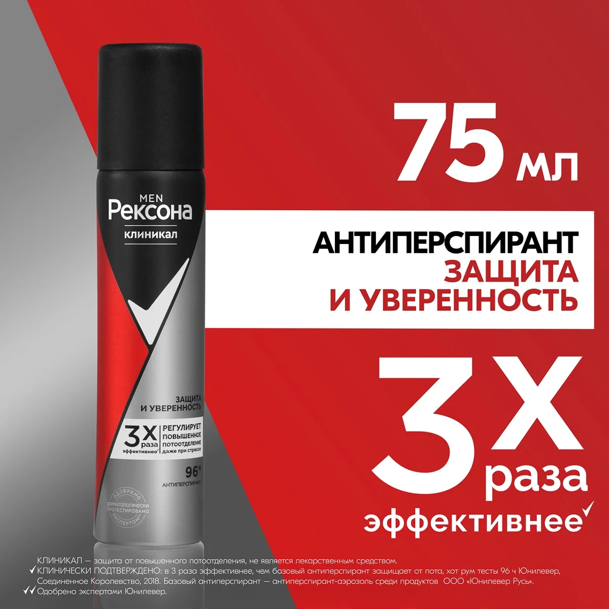 Дезодорант-антиперспирант мужской Рексона Клиникал Защита и Уверенность обеспечивает беспрецедентную защиту от пота и неприятного запаха. Аэрозольный антиперспирант для мужчин обеспечивает 96 часов непрерывной защиты от пота и запаха. Дезодорант-спрей Защита и Уверенность имеет мощный мужественный аромат с аккордами холодящего микса эвкалипта, перечной мяты и лимона. Средство небольшого объема (75мл) очень удобно взять с собой в дорогу, в поездку, в спортивный зал. Даже самые мужественные и дерзкие нуждаются в невидимой защите и уверенности. Интенсивные тренировки, стресс, пребывание в душном помещении, - все эти факторы могут спровоцировать обильное потоотделение. Базовый дезодорант не в состоянии решить эту проблему надолго. Именно поэтому эксперты бренда Rexona разработали серию Clinical Protection. Новая технология совершенной защиты Defence+ образует микропленку на поверхности кожи, обеспечивая 96 часов непрерывной защиты от пота и запаха. Благодаря тому, что частицы активного вещества стабилизированы и уменьшены, эффективность аэрозоля Защита и Уверенность 3 раза выше базового антиперспиранта. Контроль уровня потоотделения даже в экстремальных ситуациях (стресс, жара, спорт). Не требует повторного нанесения в течение дня. Мгновенно высыхает, не оставляя ощущение дискомфорта и липкости. В течение дня ты ощущаешь притягательный и свежий аромат с ноткам жгучего перца и цитрусовых, подчеркнутый свежестью озона, постепенно переходящий в кожано-древесную базу. Утренняя тренировка, насыщенный рабочий график и свидание вечером? Тебе все по силам с антиперспирантом от Rexona Аэро Защита и Уверенность. Живи в своем ритме и будь уверен. Для достижения оптимального эффекта эксперты Rexona рекомендуют наносить антиперспирант на сухую и чистую кожу подмышек перед сном. Именно в ночное время, когда организм отдыхает, потовые железы наименее активны, а кожа наиболее восприимчива к действию формулы.