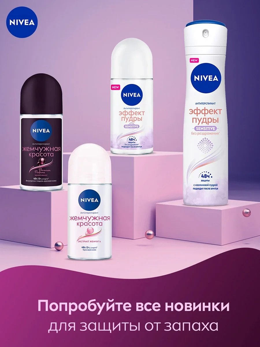 Шариковый дезодорант-антиперспирант для женщин Nivea Жемчужная красота Premium Perfume, благодаря своей формуле с экстрактом черного жемчуга, обеспечивает премиальный стойкий аромат и надёжную защиту от потоотделения и неприятного запаха на 48 часов. Для гладкой и сияющей кожи подмышек. Слишком красивых, чтобы их прятать! Дезодорант-антиперспирант быстро высыхает и защищает от неприятного запаха на 48 часов. Дерматологически протестировано. Уже более 100 лет Nivea создает особенно бережные для кожи формулы. Попробуй нежный уход за кожей от антиперспиранта Nivea без этилового спирта! Шариковый антиперспирант даёт в 2 раза больше применений, чем спрей! Применение: наносите ежедневно на чистую сухую область подмышек. Дать полностью высохнуть во избежание образования пятен на одежде. Не наносить на поврежденную или раздраженную кожу.