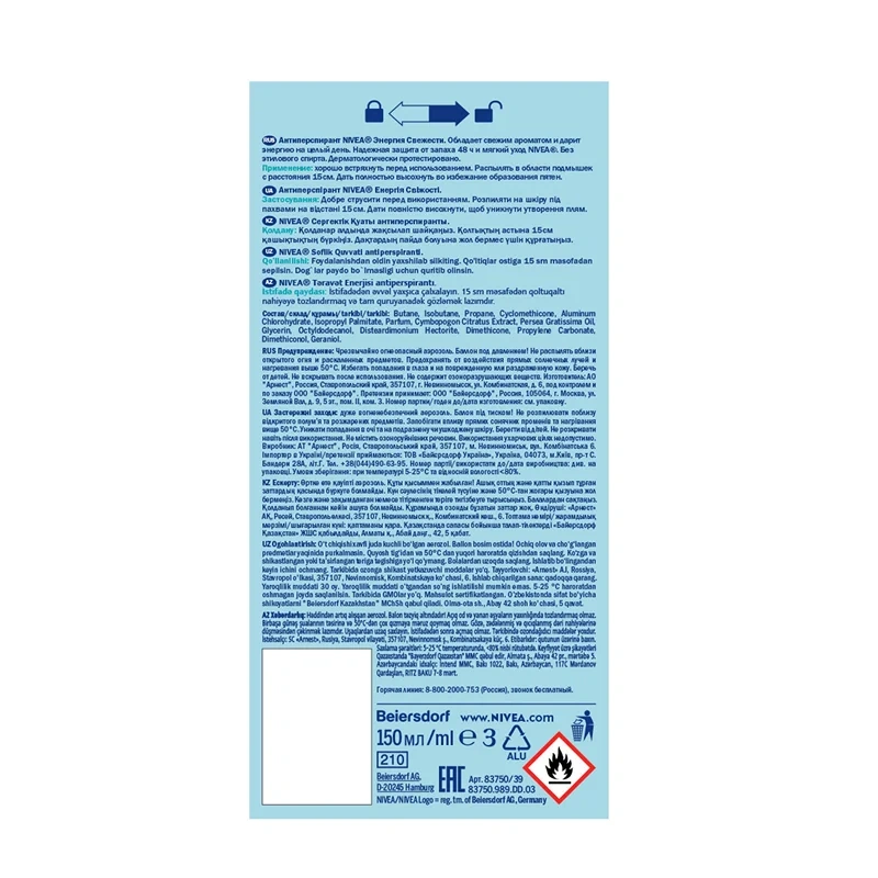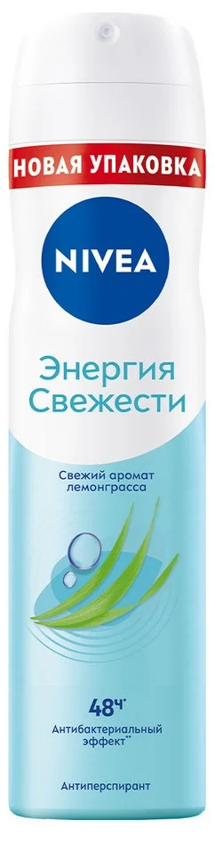 Дезодорант-антиперспирант энергия свежести от Nivea дарит Вам ощущение бодрящей свежести, которое Вы чувствуете весь день. Благодаря специальной формуле с экстрактом лемонграсса Вы можете эффективно контролировать уровень потоотделения в течение 48 часов. Оптимальная комбинация надёжной защиты от пота и бережной заботы от Nivea.