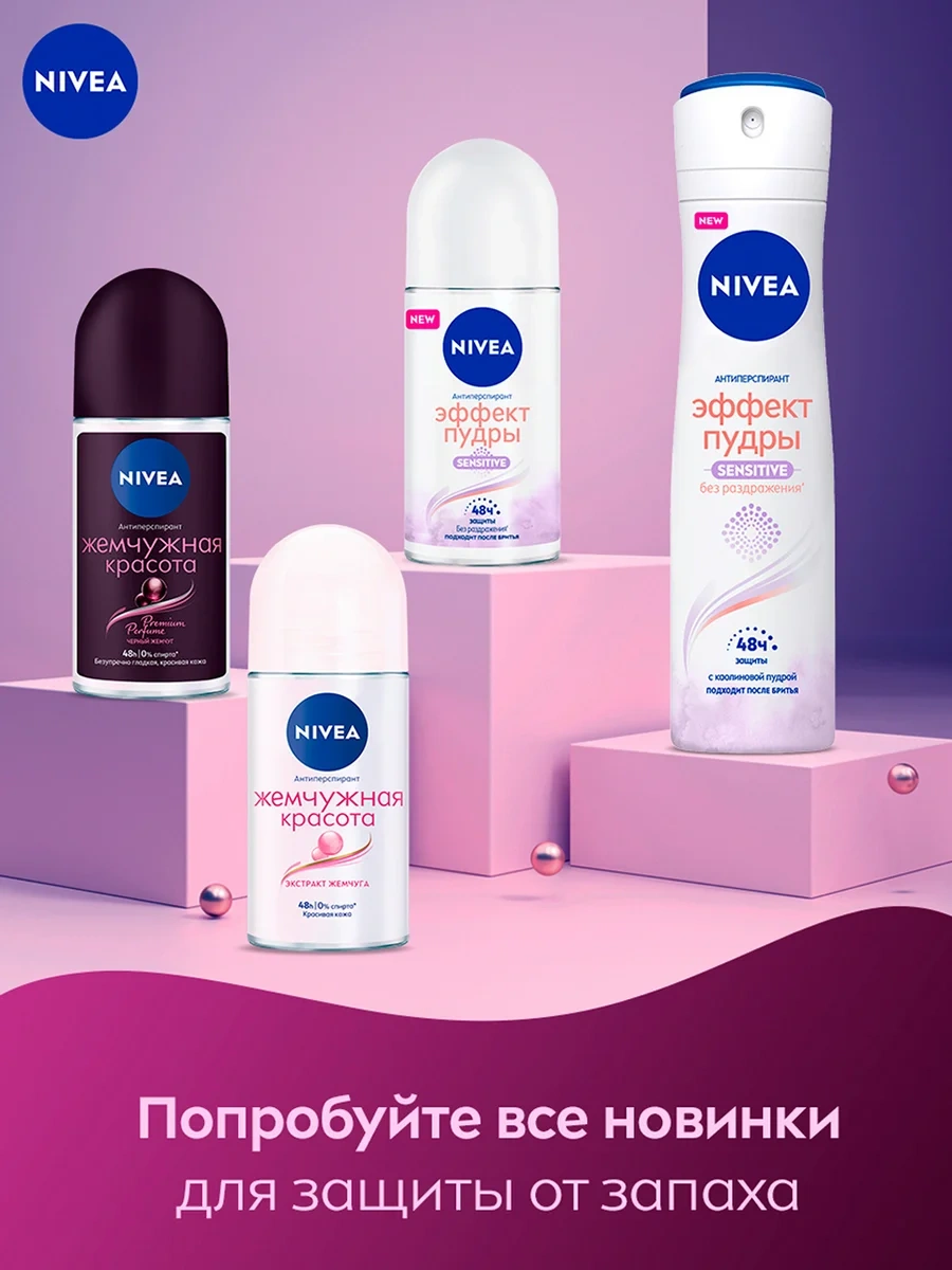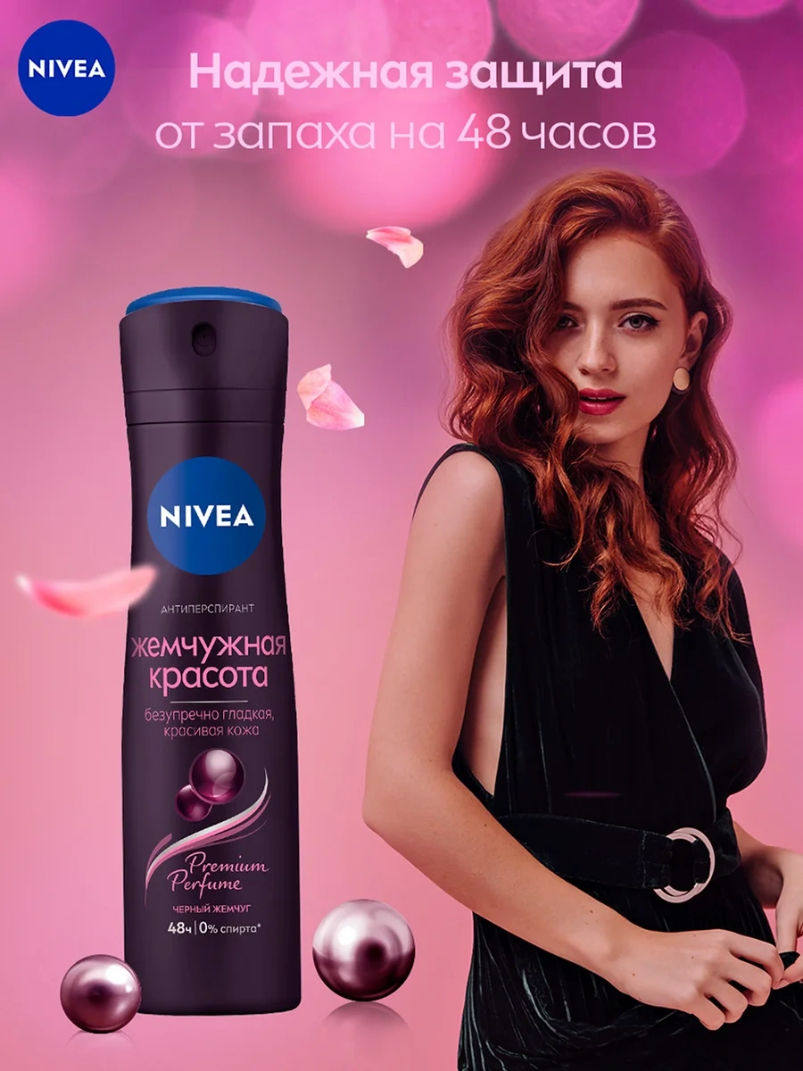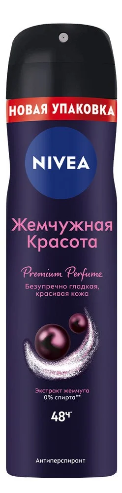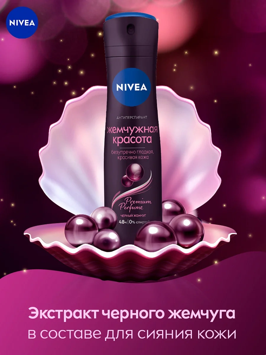 Дезодорант-антиперспирант спрей для женщин Nivea Жемчужная красота Premium Perfume, благодаря своей формуле с экстрактом черного жемчуга обеспечивает премиальный стойкий аромат и надёжную защиту от потоотделения и неприятного запаха на 48 часов. Для гладкой и сияющей кожи подмышек. Слишком красивых, чтобы их прятать! Дезодорант-антиперспирант быстро высыхает и защищает от неприятного запаха на 48 часов. Без ощущения липкости на коже. Дерматологически протестировано. Уже более 100 лет Nivea создает особенно бережные для кожи формулы. Попробуй нежный уход за кожей от антиперспиранта Nivea без этилового спирта! Применение: хорошо встряхнуть перед использованием. Распылять в области подмышек с расстояния 15-20 см. Дать полностью высохнуть во избежание образования пятен на одежде.