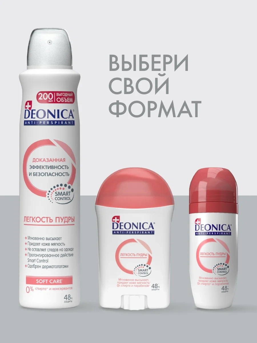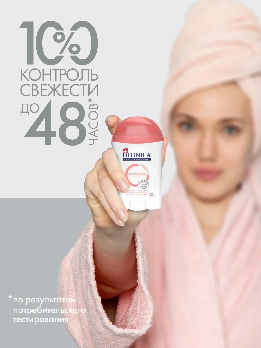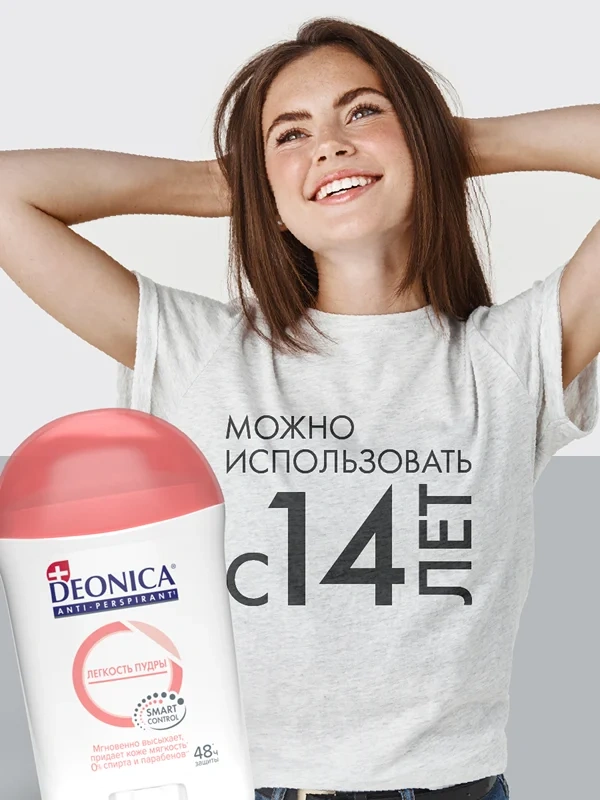 Почувствуйте непревзойденную легкость и свежесть с дезодорантом-антиперспирантом Deonica Легкость пудры. Он мгновенно высыхает, придавая коже невероятную мягкость и нежность, обеспечивая надежную защиту от пота и неприятного запаха до 48 часов.