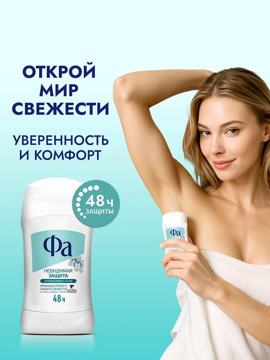 Антиперспирант-стик Фа Невидимая защита обеспечивает эффективную защиту от пота, неприятного запаха и пятен до 48 часов благодаря технологии Freshness Protect.