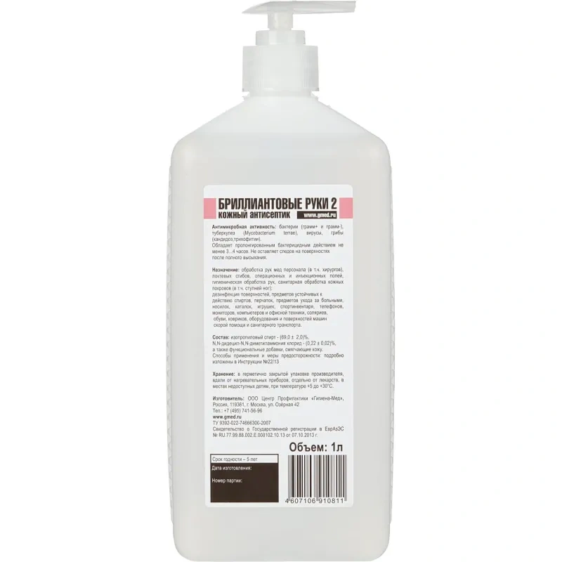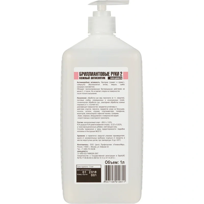Антисептик для рук с дозатором Бриллиант Бриллиантовые руки-2 1л, кожный, спиртовой, для медицинских учреждений, с дозатором
