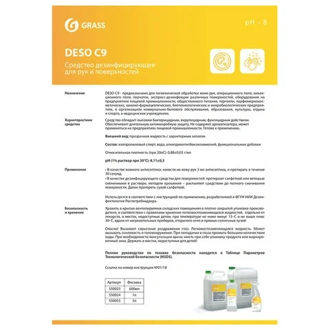 Дезинфицирующее средство (антисептик) Grass Deso C9 5 лНазначение: Средство предназначено для г...