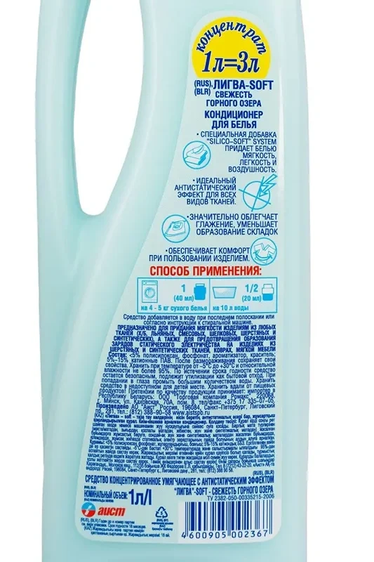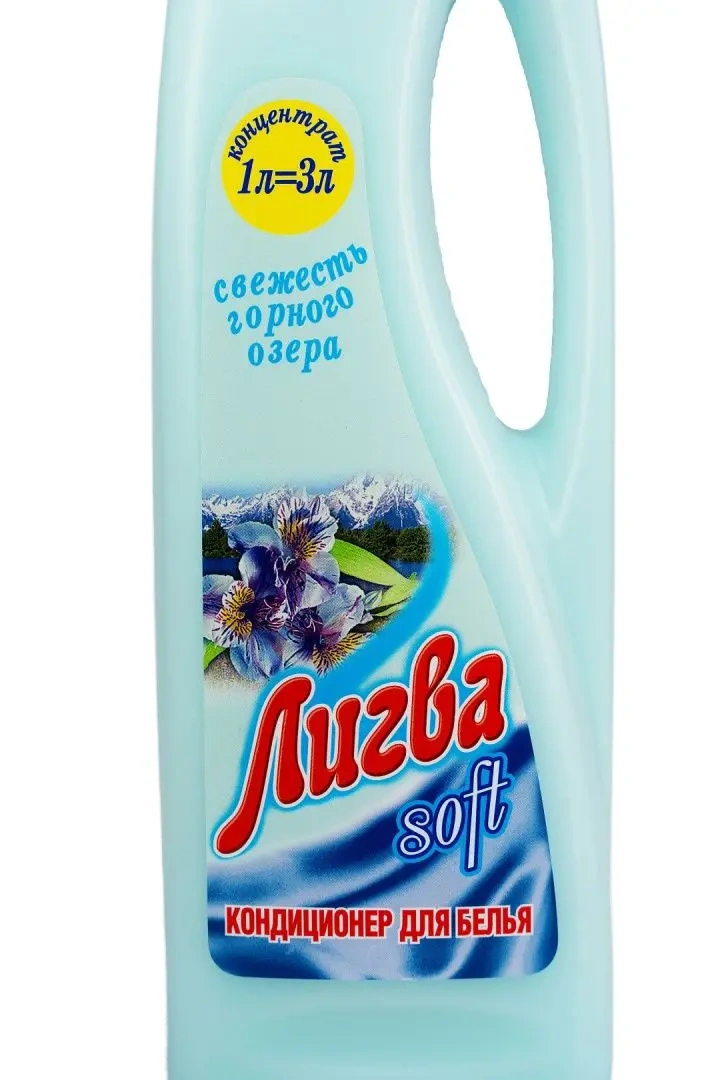Кондиционер для белья Лигва soft.Состав: <5% полисилоксан, неионогенные ПАВ, фосфонат; 5%-15% катионные ПАВ.Дополнительно: ароматизатор, краситель.Срок годности: 18 мес.ТУ 2382-012-00335215-96