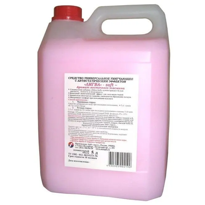 Кондиционер для белья Лигва soft.Состав: <5% полисилоксан, неионогенные ПАВ, фосфонат; 5%-15% катионные ПАВ.Дополнительно: ароматизатор, краситель.Срок годности: 18 мес.ТУ 2382-012-00335215-96