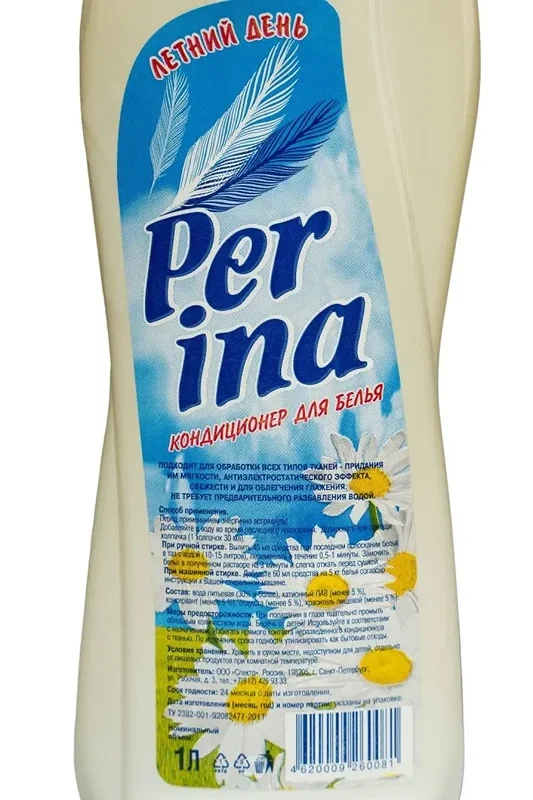 Кондиционер для белья PerinaСостав:катионные ПАВ, ароматизирующие добавки, краситель, консервант, вода питьевая.Срок годности: 24 мес.ТУ 2382-001-92082477-2011