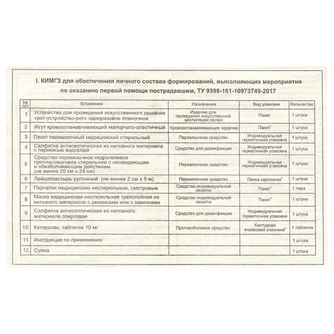 КИМГЗ укомплектован в соответствии с приказом Министерства здравоохранения РФ от 15 февраля 2013г. № 70н «Об утверждении требований к комплектации лекарственными препаратами и медицинскими изделиями комплекта индивидуального медицинского гражданской защиты для оказания первичной медико-санитарной помощи и первой помощи» и приказом Министерства РФ по делам гражданской обороны, чрезвычайным ситуациям и ликвидации последствий стихийных бедствий от 23.01.2014 г. № 23 «О внесении изменений в приказ МЧС России от 01.11.2006 № 633 и признании утратившим силу приказа МЧС России от 25.05.2007 № 289».