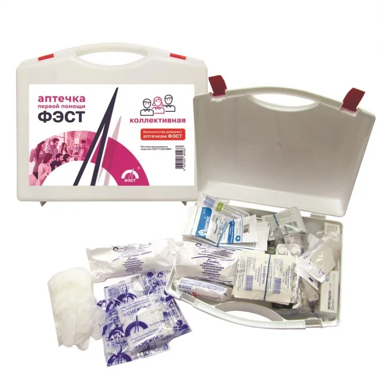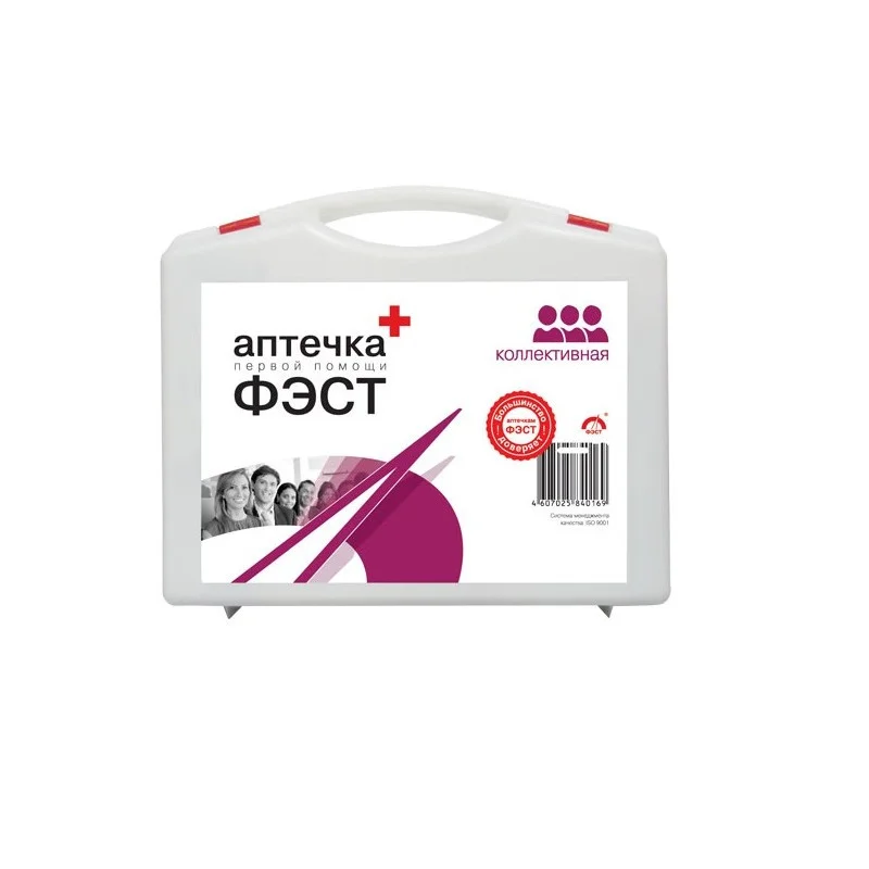Аптечка первой помощи коллективная ФЭСТ. Рассчитана на рабочий коллектив из 15-20 человек. Используется в том случае, если есть необходимость обеспечить комплексную первую медицинскую помощь при возможных травмах и различных недомоганиях на рабочем месте. Изготавливается в соответствии с ТУ производителя. ТУ 9398-058-10973749-2008. Аптечка упакована в футляр-чемоданчик из полистирола размером 30,5×26,5×10 см. № Содержание коллективной аптечки ФЭСТ: Состав: