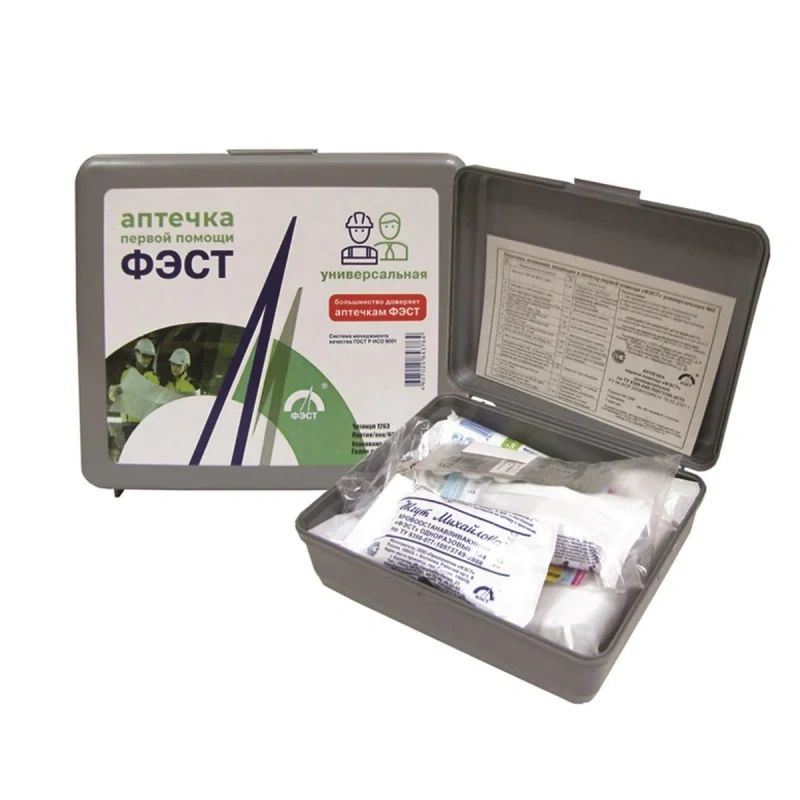 Аптечка 'ФЭСТ' универсальная используется для оказания первой неотложной помощи в экстренной ситуации на производстве. Рассчитана на 7 человек. Аптечка содержит обезболивающие средства, дезинфицирующие вещества и перевязочные материалы. Упакована в пластиковый футляр в форме чемодана с защелкивающимися клипсами. Размер — 21×21×7,5 см. Срок годности — 18 месяцев с даты упаковывания.