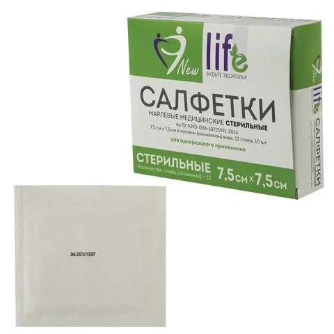 Салфетка марлевая стерильная NEW LIFE КОМПЛЕКТ 10 шт., 12 слоев, 7,5х7,5 см, плотность 36 (±2) г/м2,