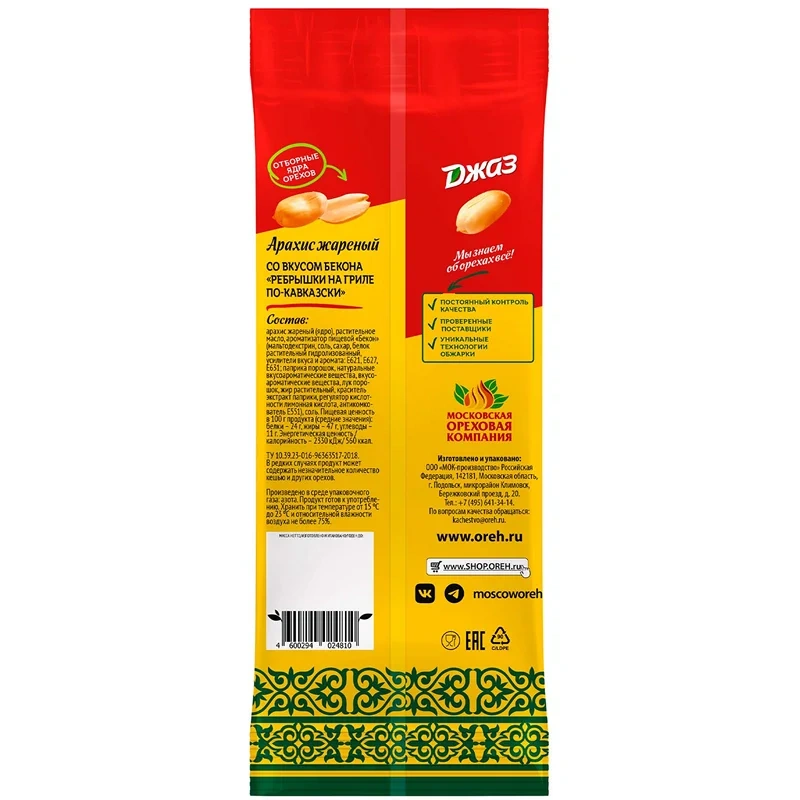 Арахис Джаз - это уникальный продукт на российском рынке. Цельный бразильский арахис сорта Раннер обжаривается с добавлением растительного масла. Для придания ему вкуса жареных на гриле ребрышек используется высококачественная вкусоароматическая добавка с натуральными составляющими. У нас проверенные поставщики, уникальные технологии обжарки и постоянный контроль качества всех этапов производства.