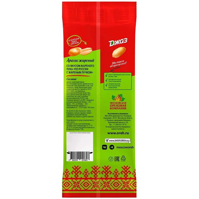 Арахис Джаз - это уникальный продукт на российском рынке. Цельный бразильский арахис сорта Раннер обжаривается с добавлением растительного масла. Для придания ему вкуса жареного лука используется высококачественная вкусоароматическая добавка с натуральными составляющими. У нас проверенные поставщики, уникальные технологии обжарки и постоянный контроль качества всех этапов производства.