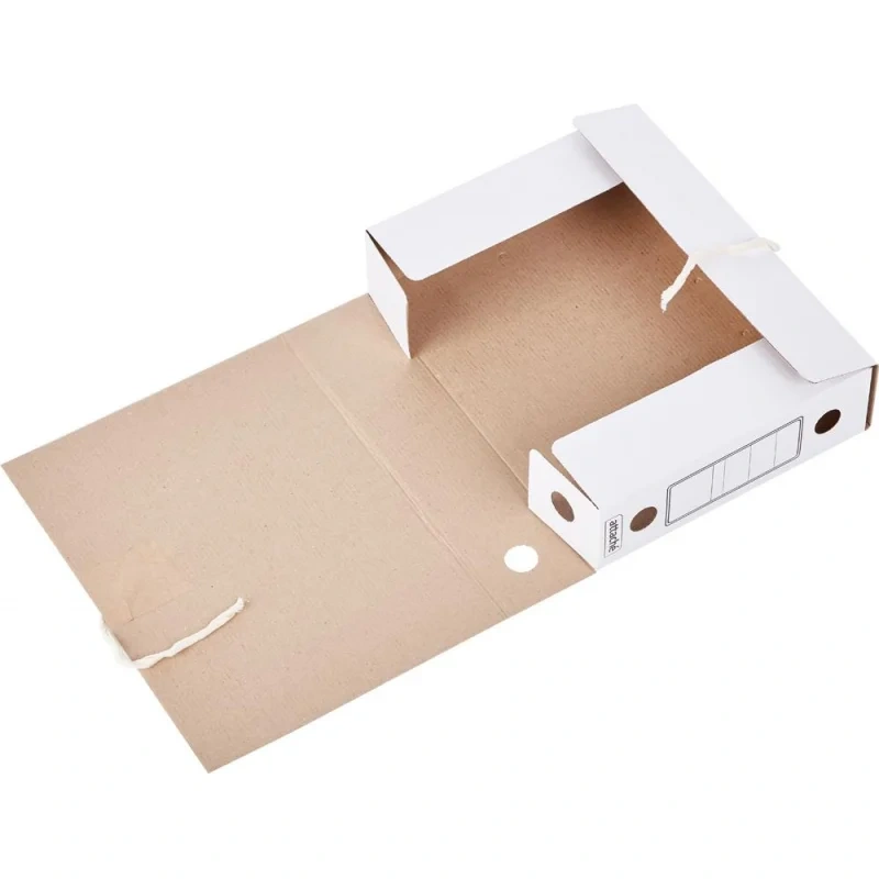 Архивная папка-короб Attache формата А4 выполнена из гофрокартона белого цвета. В закрытом состоянии фиксируется с помощью двух завязок. Ширина — 75 мм. Предусмотрены поля для надписей. Вместимость — до 750 листов стандартной плотности. Круглые отверстия на корешках предназначены для удобного захвата папки как в вертикальном, так и в горизонтальном положении. Поставляется в разобранном виде. Внутренний размер — 244×75×322 мм. Внешний размер — 252×78×326 мм. Гофрокартон Т21 — экологически чистый и пригодный для переработки материал.