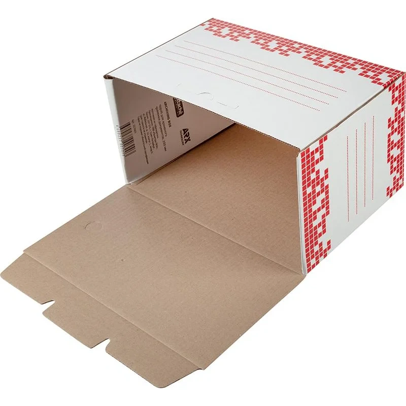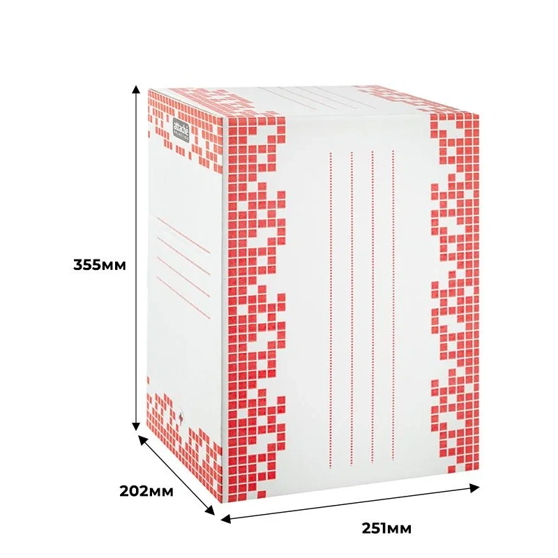 Ширина корешка составляет 200 мм. Короб вмещает 2000 листов стандартной плотности. Внешний размер: 251×202×355 мм. Внутренний размер: 242×195×340 мм.