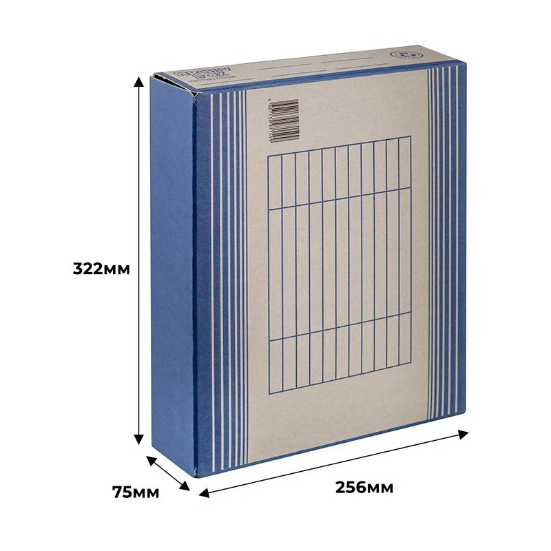 Возможно вертикальное и горизонтальное размещение, на стеллажах или в архивных коробах. Легкая сборка. Крышка короба фиксируется вырубным креплением. На корешке и боковых сторонах есть поля для надписей.