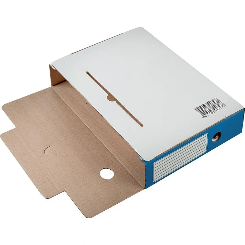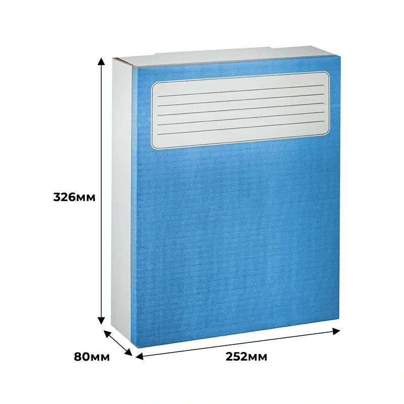 Возможно вертикальное и горизонтальное размещение, на стеллажах или в архивных коробах. Легкая сборка. Крышка короба фиксируется вырубным клапаном. На корешке и боковых сторонах есть поля для надписей.