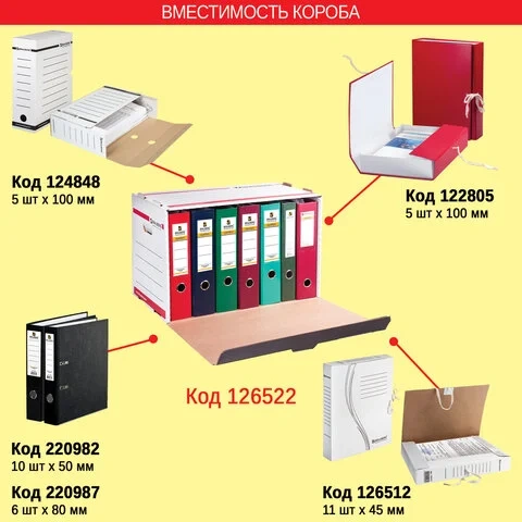 Изготовлен из гофрокартона марки Т-24, профиль «В». Толщина картона - 3 мм. Вмещает 6 папок-регистраторов с толщиной корешка 80 мм или 3 накопителя документов с толщиной корешка 150 мм. Выдерживает до 50 кг. Размер короба - 33,8x52,5x30,6 см. Имеет откидную крышку и отверстия по бокам для удобства переноски. Поставляется в разобранном виде.
