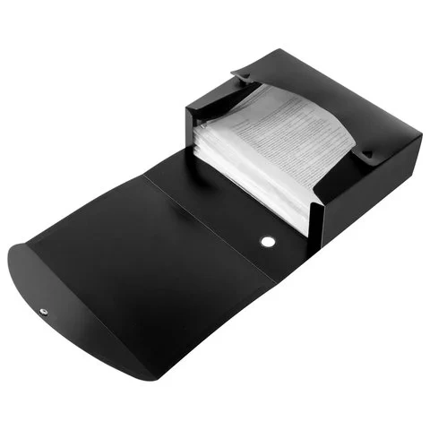 Изготовлен из пластика черного цвета толщиной 0,9 мм. Ширина корешка - 100 мм. Вмещает до 900 листов формата А4. Закрывается на кнопку. Сохраняет отличный внешний вид в течение всего срока службы. Поставляется в разобранном виде.
