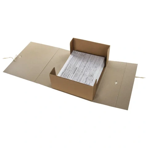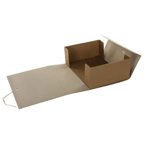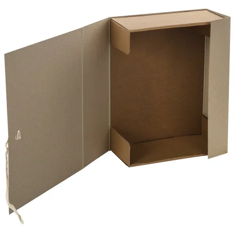 Вмещает до 900 листов формата А4, в том числе картонные скоросшиватели, папки с завязками, обложки “Дело”. Изготовлен из переплетного картона толщиной 1,25 мм. В закрытом виде фиксируется с помощью двух хлопчатобумажных завязок. Способен выдержать 5 кг. Имеется откидная крышка. Выполнен в сером цвете. Размер - 330х100х240 мм.