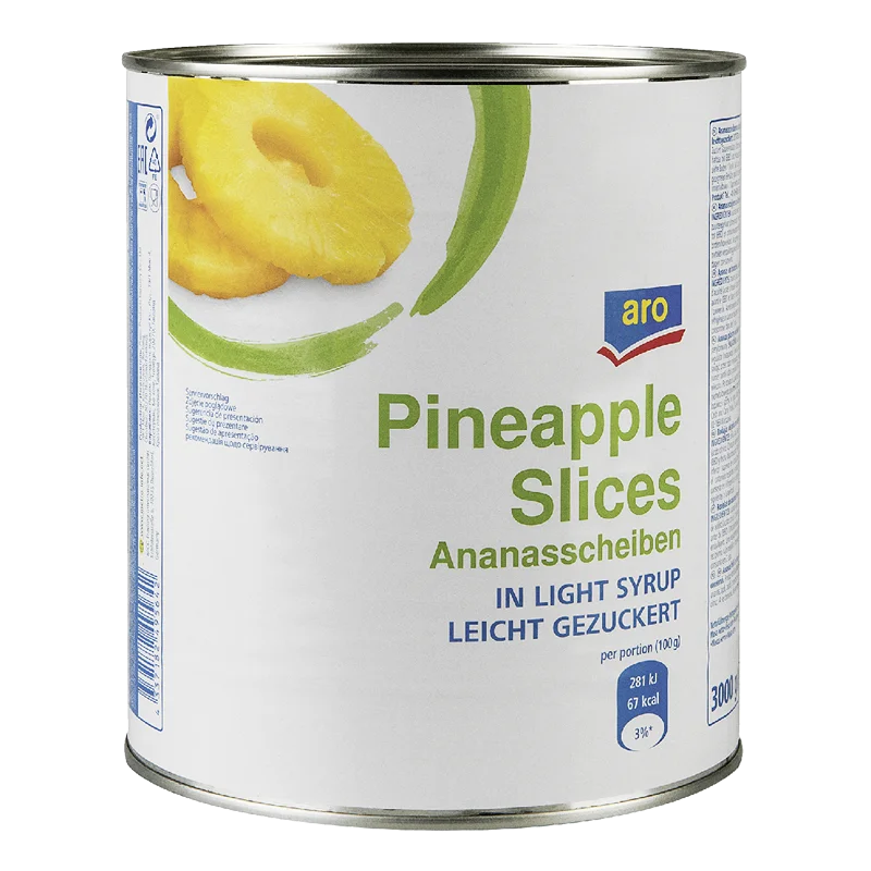 aro Ананасы колечки, 3кг обладают ярко-выраженным вкусом с легкой кислинкой и приятным ароматом. Тропический фрукт содержит хорошо сбалансированный комплекс полезных веществ. Благодаря высокому содержанию витамина С в ярких плодах продукт при регулярном употреблении помогает лучше справляться с простудными заболеваниями. Присутствующий в составе фрукта калий улучшает доставку кислорода к клеткам мозга, что благотворно сказывается на состоянии нервной системы. Ананас способствует улучшению процесса пищеварения, что, в свою очередь, дает импульс метаболизму. Продукт продается в железной банке.