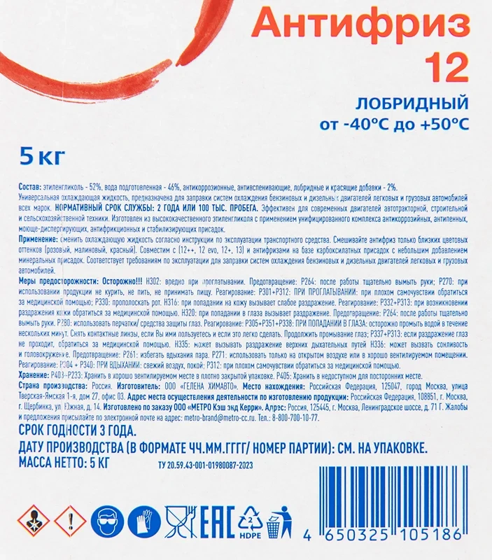 Карбоксилатный антифриз последнего поколения предназначен для использования в системах охлаждения двигателей внутреннего сгорания. Изготовлен с применением уникального пакета присадок, что позволяет оставаться антифризу неизменным в течение всего срока эксплуатации и обеспечивает длительную защиту от высокотемпературной коррозии цветных металлов. Совместим со всеми типами охлаждающих жидкостей на основе этиленгликоля и органических ингибиторов коррозии.