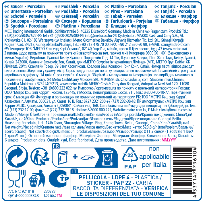 | Комплектация | блюдце для чашки - 6 шт. |