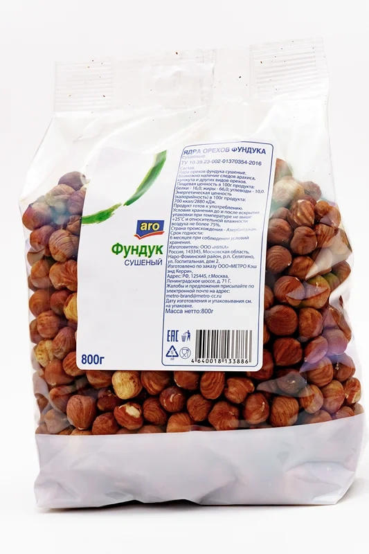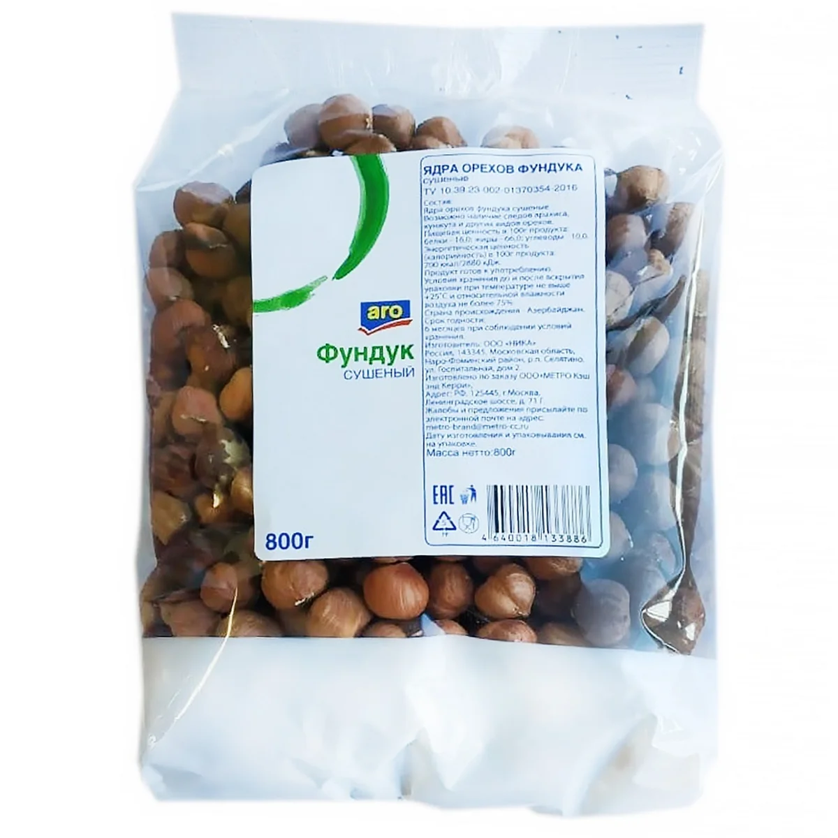 Сушеный фундук ARO – это отборные ядра лесного ореха с нежной сливочной мякотью и сладковато-ореховым вкусом. Натуральный продукт хорошо подходит в качестве перекуса (суточная норма – 5-10 шт), используется для приготовления шоколадных паст и десертов. Он богат белком, антиоксидантами, витаминами группы Е и Н, магнием, кобальтом, медью. Регулярное употребление орешков способствует улучшению памяти, обновлению клеток, предупреждает развитие заболеваний сердца и сахарного диабета. Продукт полезен при планировании и вынашивании беременности, он улучшает состояние при повышенной тревожности и нервных расстройствах. Орехи находятся в плотной прозрачной упаковке, которая позволяет визуально оценить содержимое, сохраняет его свежесть и полезные свойства. Бренд: ARO. Производитель: Metro C&C. Страна-изготовитель: Россия. Состав: ядра фундука целые, сушеные. Примечание к составу: продукт противопоказан при индивидуальной непереносимости, может содержать фрагменты скорлупы, следы арахиса, кунжута и других орехов.Пищевая ценность (на 100 г продукта): белки – 12,6 г, жиры – 62,4 г, углеводы – 13,7 г.Энергетическая ценность (на 100 г продукта): 679 ккал. Условия хранения: хранить в сухом прохладном месте при температуре не выше 20°С и относительной влажности воздуха не более 70%. Срок хранения: 12 месяцев. Упаковка: пластиковый пакет. Вес: 800 г.Особенности: с осторожностью следует употреблять продукт детям и людям с предрасположенностью к пищевой аллергии.ТУ 9761-004-60458573.