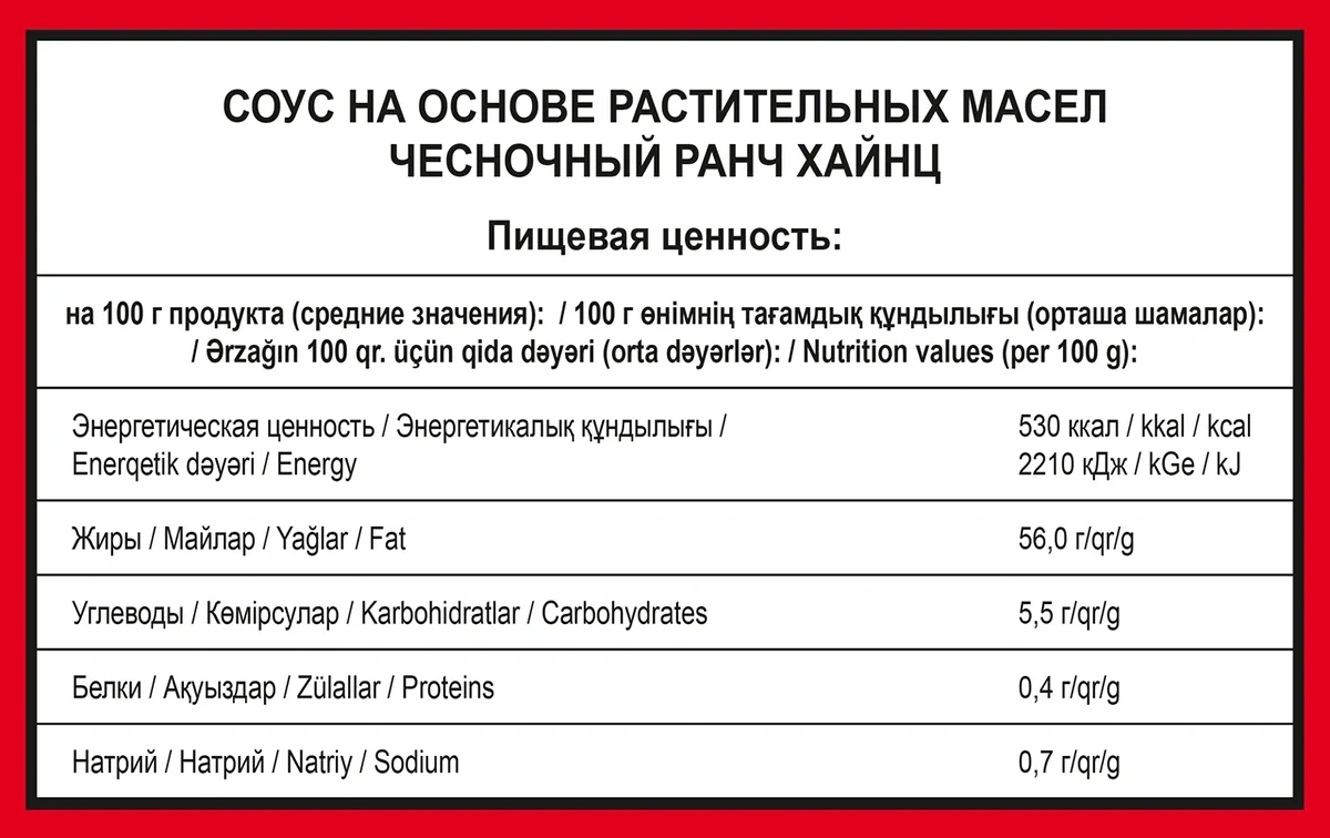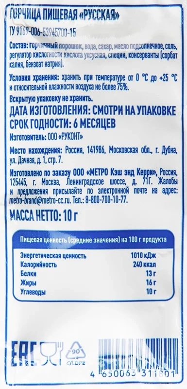 Порошок горчичный, вода, сахар, масло подсолнечное, соль, кислота уксусная, специи, бензоат натрия, сорбат калия.Характеристики