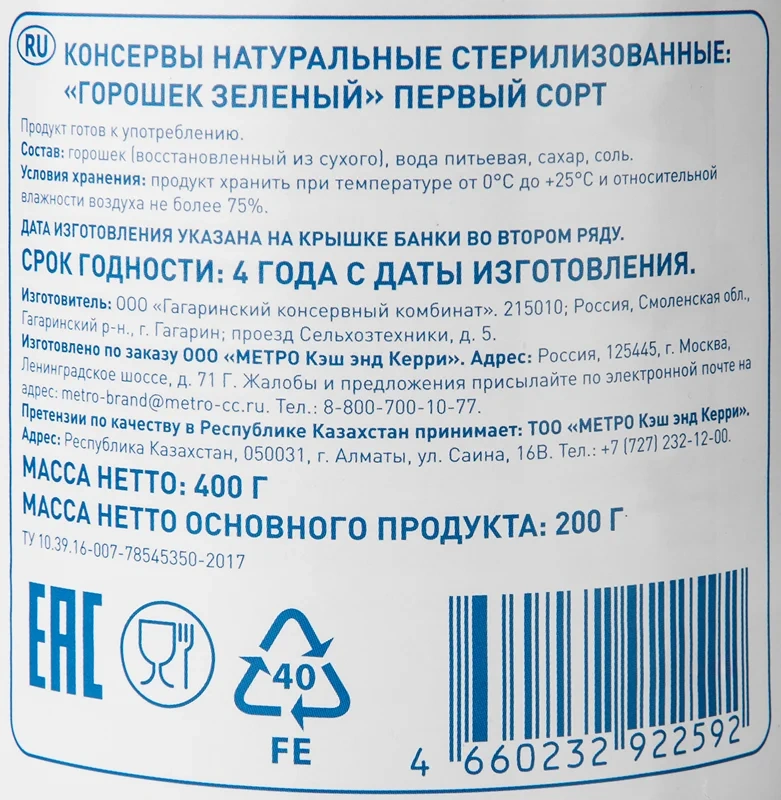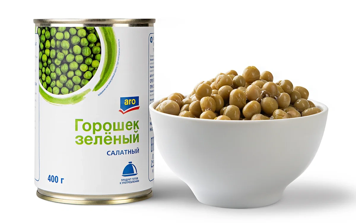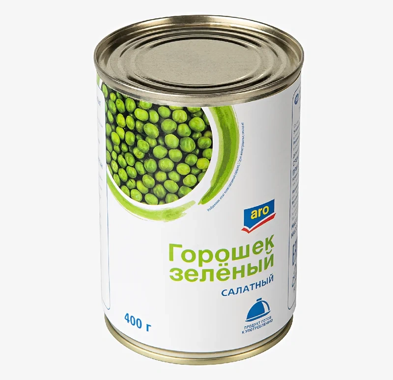 Горошек зеленый из мозговых сортов. Стерилизованный. Приготовлен из молодых нежных зерен. Является диетическим продуктом.