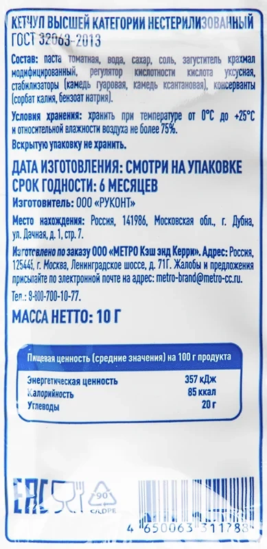 Паста томатная, вода, сахар, соль, загуститель крахмал модифицированный, регулятор кислотности кислота уксусная, стабилизаторы (камедь гуаровая, камедь ксантановая), консерванты (сорбат калия, бензоат натрия).