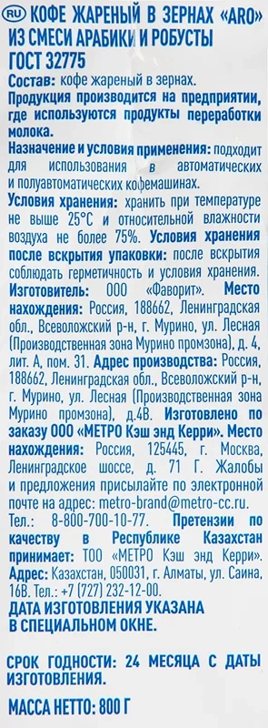 Кофе жареный в зернах aro из смеси Арабики и Робусты.