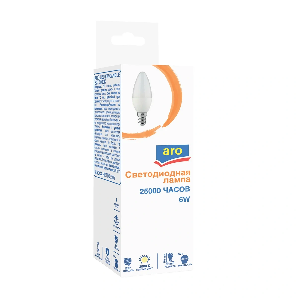 aro Лампа светодиодная E27 3000K Led 6Вт свеча