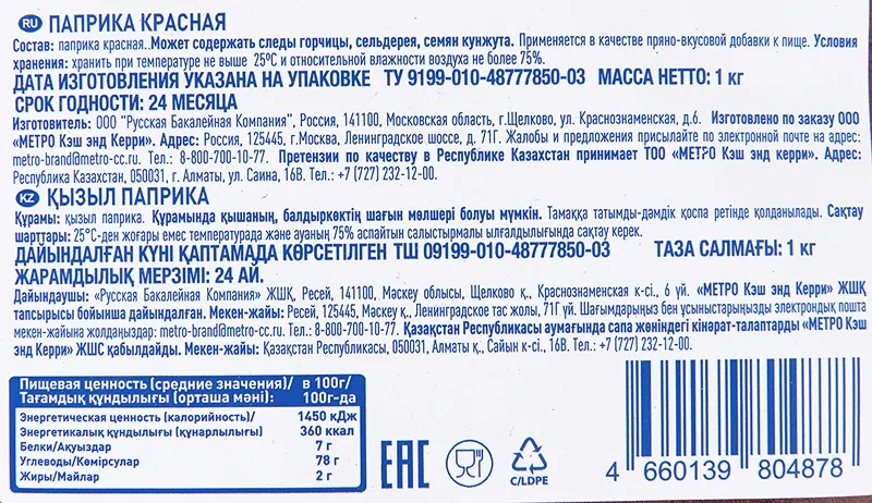 Изготавливается из высушенных спелых плодов красного перца, которые измельчаются до состояния порошка. Это незаменимый компонент гуляша, маринадов, рагу и других блюд. Помимо приятного вкуса, специя придает продуктам яркий оттенок. Для сохранения пищевых качеств паприку необходимо хранить в темном и прохладном месте не более полугода, так как под воздействием солнечных лучей она теряет свой цвет и становится безвкусной.