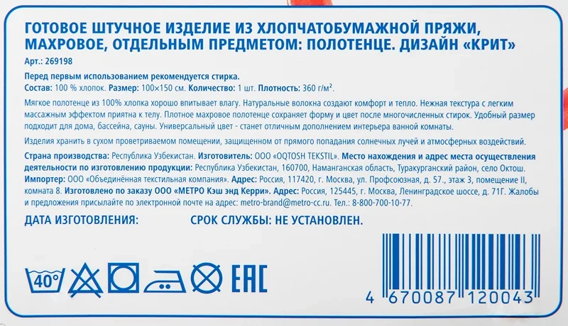 | Комплектация | полотенце - 1 шт. 100х150см |