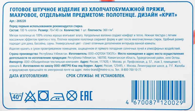 | Размер полотенца, см | 70 х 140 |