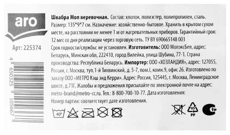 aro Швабра моп хлопок, 180г предназначена для влажной уборки полов, плитки, кафеля, линолеума, ламината и др. Используется вместо традиционных тряпок. Рассчитан для малых объемов уборки и плинтусных зон, долговечен на гладких и шероховатых полах. Отлично собирает грязь, впитывает влагу, не оставляет ниток и разводов.