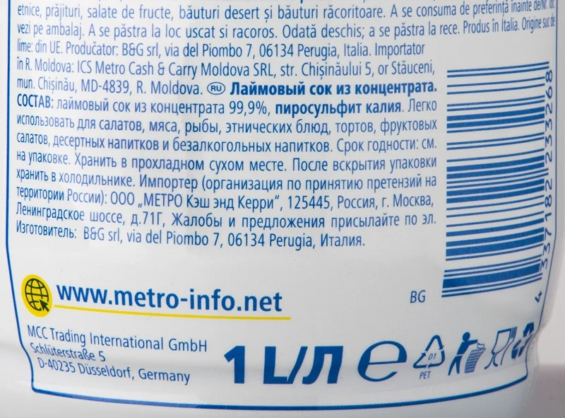 Сок получен путём отжима лайма. Благодаря использованию самых лучших и отборных цитрусов, сок имеет интенсивный аромат и удивительный освежающий вкус. Удобно использовать для салатов, мяса, рыбы, этнических блюд, тортов, фруктовых салатов, десертных напитков и безалкогольных напитков.