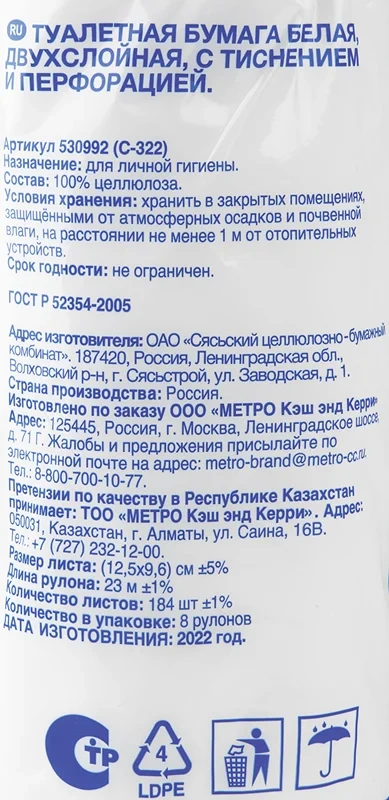aro Туалетная бумага крепированная белого цвета без аромата состоит из двух слоев и имеет общую длину рулона 23 м. В упаковке восемь рулонов с тиснением и перфорацией.